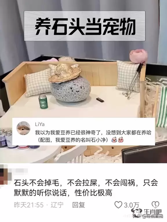 养宠物石头的相关帖子下还有一条高赞评论:“石头不掉毛、不拉屎、不闯祸,只会默默的听你说话,性价比极高”。