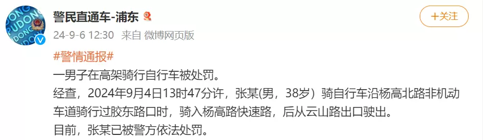 上海市公安局浦东分局官方微博通报,一男子在高架骑行自行车被处罚。