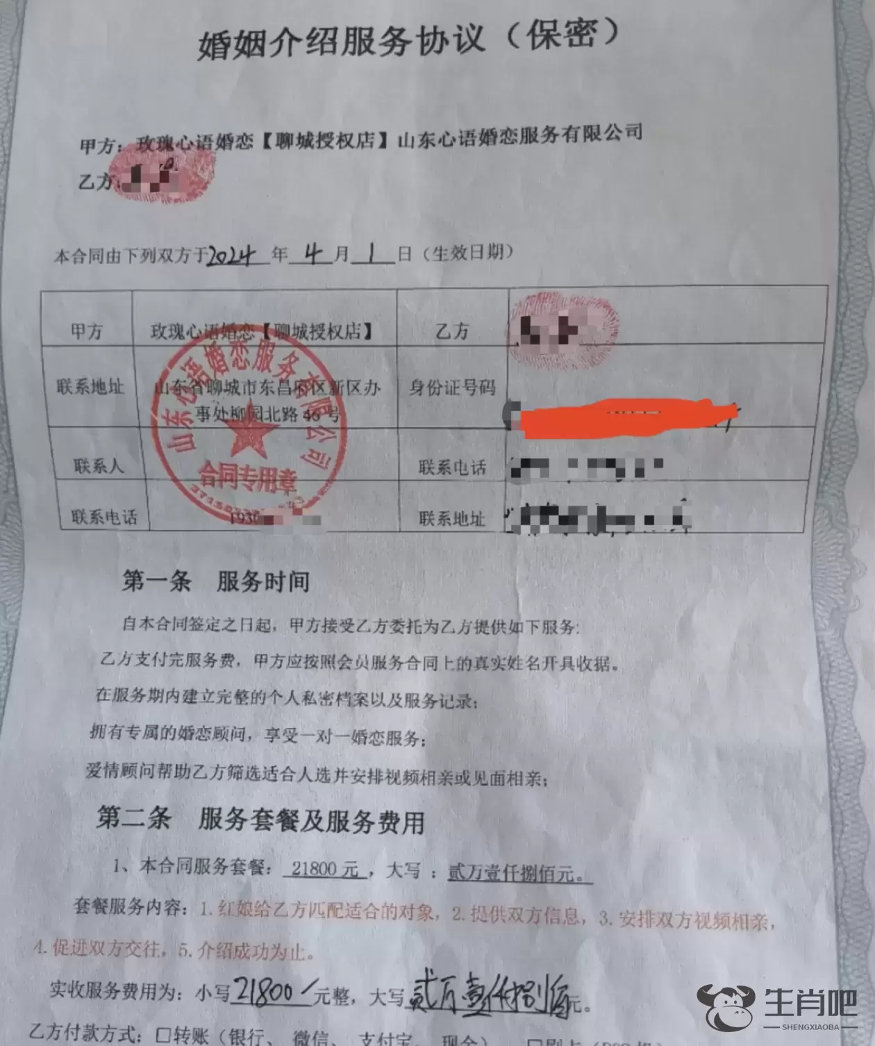 在线上联系后,4月2日对方工作人员将陈晋约到了线下门店沟通,“他们说相亲服务费21800元,能一直服务到介绍成功,而且后续女方如果有问题、需要打官司什么的,他们也可以协助我处理。”陈晋称,自己之前没有过相亲经验,就缴纳了21800元,签署了一份《婚姻介绍服务协议》。