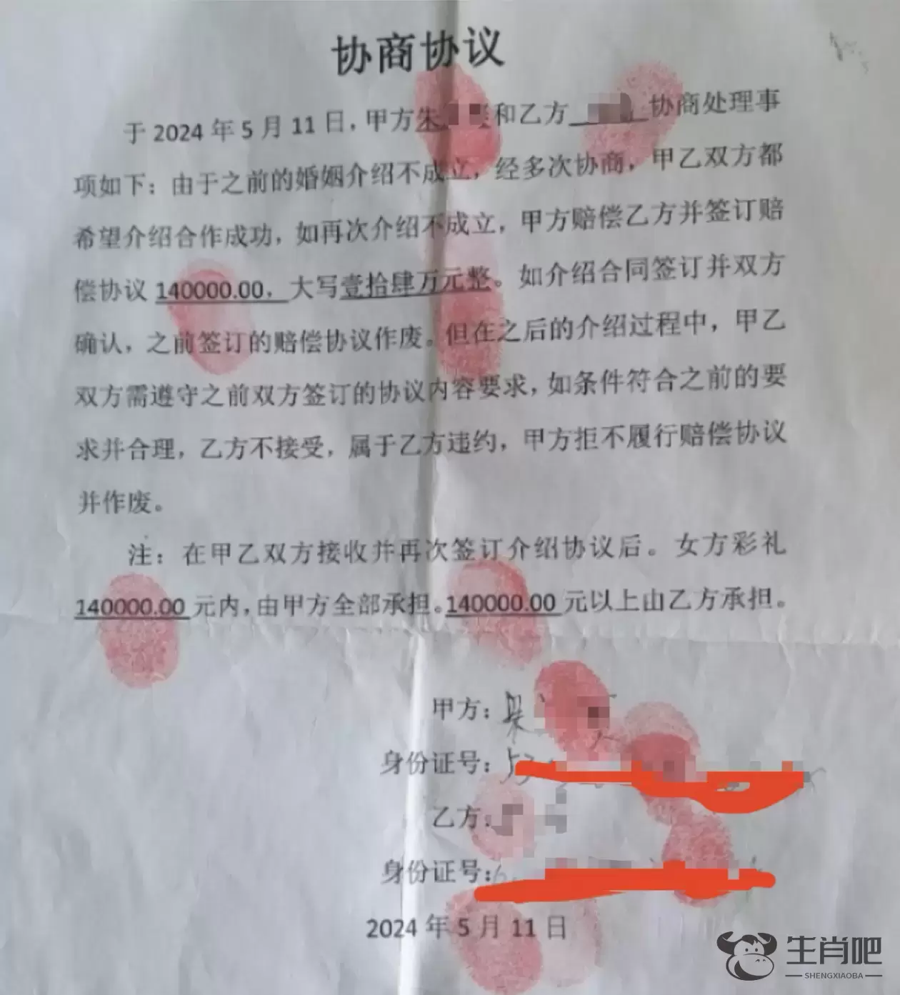 陈晋说,事后自己多次想报警,但朱某称可以为他重新匹配女方,并不用再承担彩礼钱。为了能挽回14万元的损失,5月8日,陈晋随朱某前往云南昭通市等待相亲,双方还签署了一张14万元的欠条和协商协议,协议称,如果再次介绍的婚姻不成立,朱某将赔偿陈晋14万元,如果介绍成功,女方14万元内的彩礼由朱某承担。