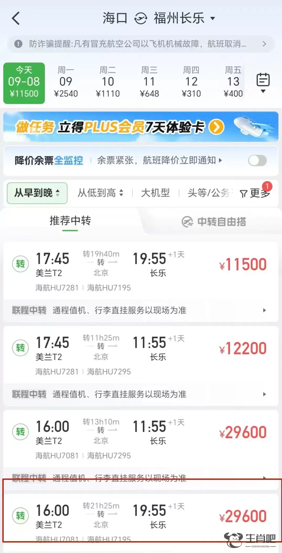 某航空公司表示,9月9日的机票情况也不乐观,依然没有海口飞福州的直达机票。