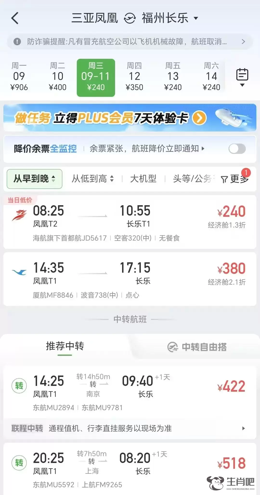 航司表示,9月10日开始,海口直飞福州最低票价1410元,11日跌至746元。三亚飞福州航班,10日之后直飞票价最低400元,11日最低240元。