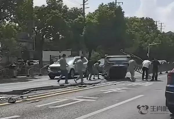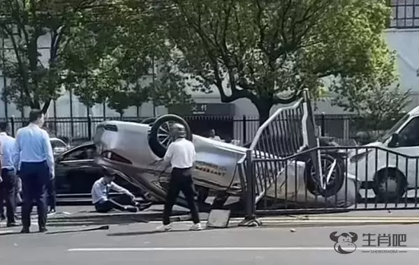 新民晚报记者了解到,当时一辆轿车沿江杨南路由北向南行驶,至江杨南路1646号门口时,与一辆SUV发生擦撞。轿车翻车,四轮朝天,还撞倒了道路中央的隔离栏,前挡风玻璃碎裂,车身多处受损。SUV左侧反光镜损坏。
